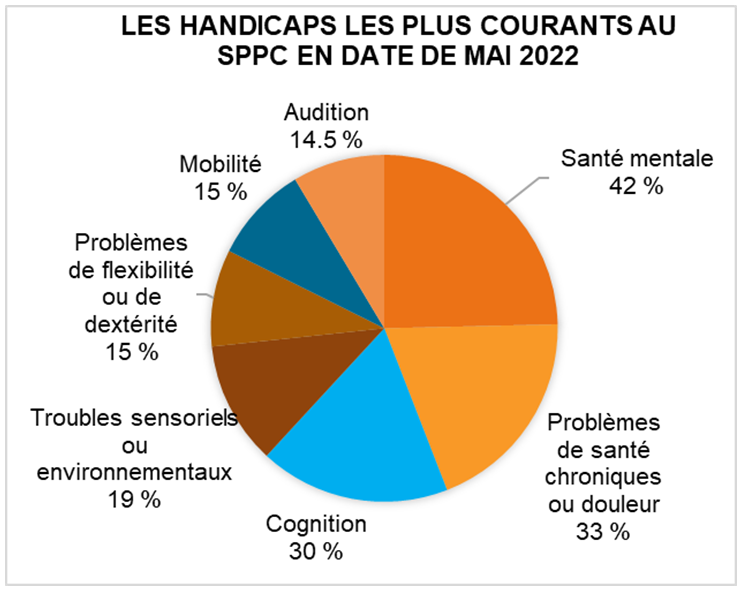 Le SPPC tente d’apporter deux changements importants, tout en réalisant des progrès en favorisant les mesures d’adaptation qui permettent aux employés de donner le meilleur d’eux-mêmes au travail. Premièrement, nous souhaitons réorienter le discours entourant le fait de vivre avec un handicap afin d’éliminer les préjugés qui persistent à l’endroit de personnes vivant en situation d’handicap. Deuxièmement, nous voulons créer un milieu de travail qui est inclusif dès sa conception.